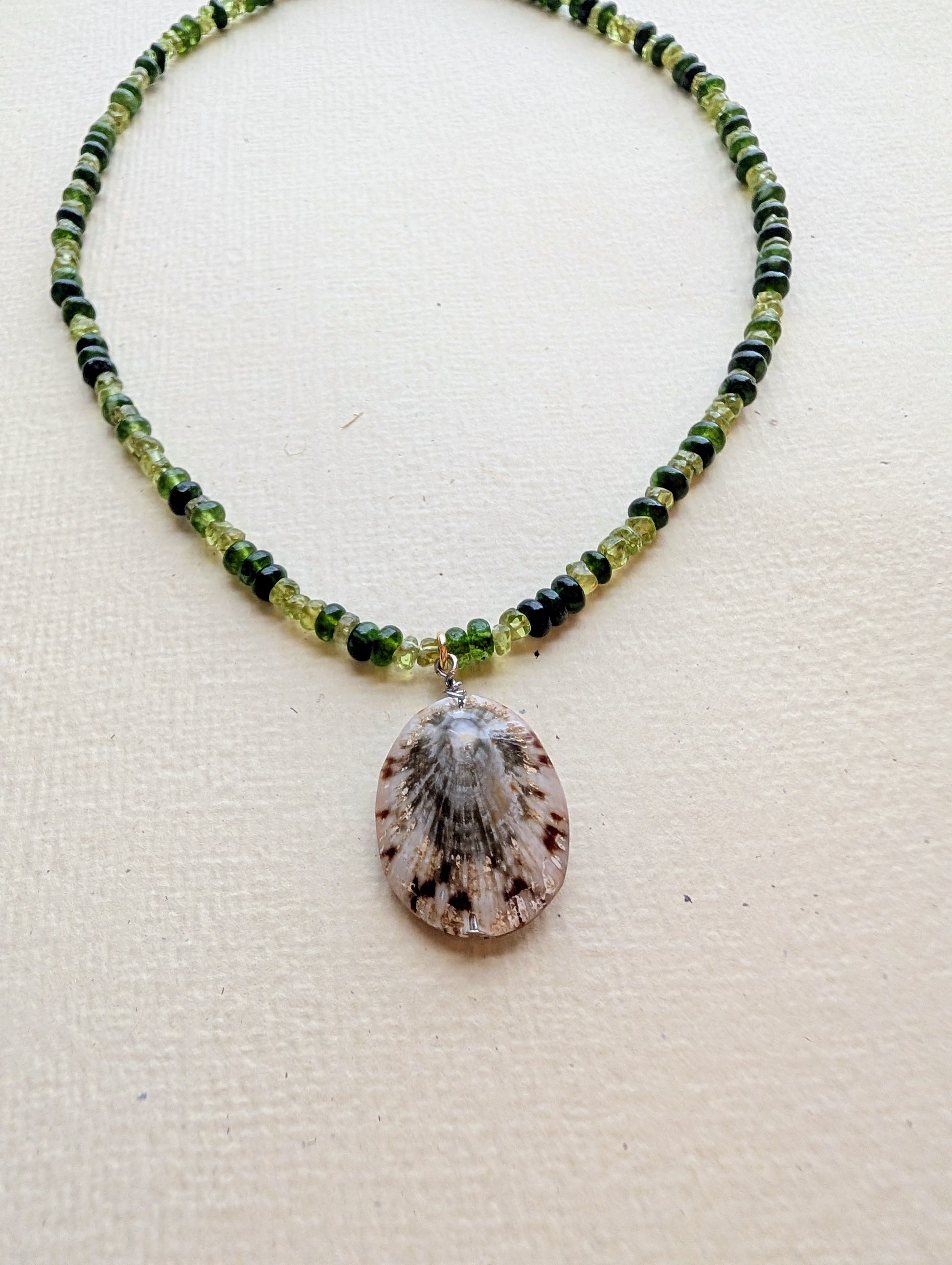 Materials: Mixed natural peridot gemstones, tortoise‑pattern limpet shell pendant, gold‑plated stainless steel findings