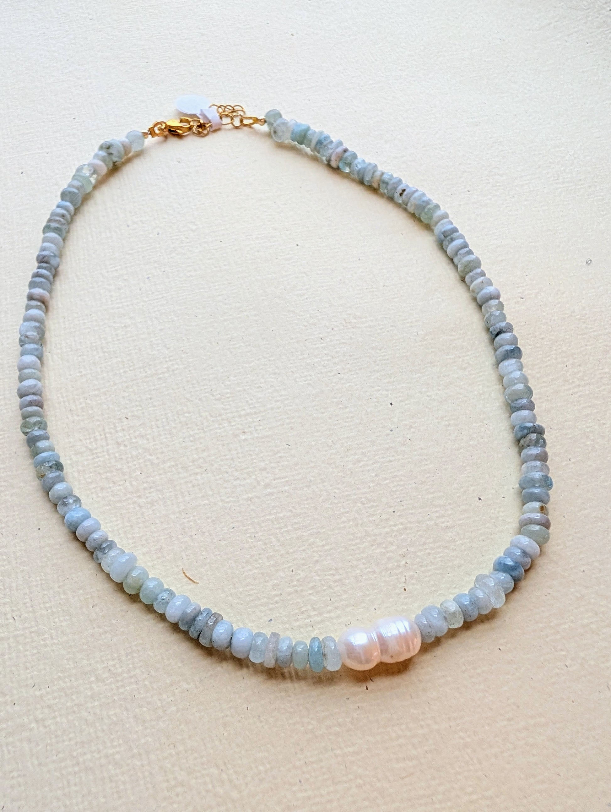 A soft, ocean‑inspired layer crafted from natural aquamarine — a pale blue gemstone known for its calm, watery glow. Finished with a single freshwater pearl accent, Mini 12 adds a subtle touch of elegance to your coastal stack. Made with durable, gold‑plated stainless steel components, it’s waterproof, tarnish‑resistant, and designed for effortless everyday wear.