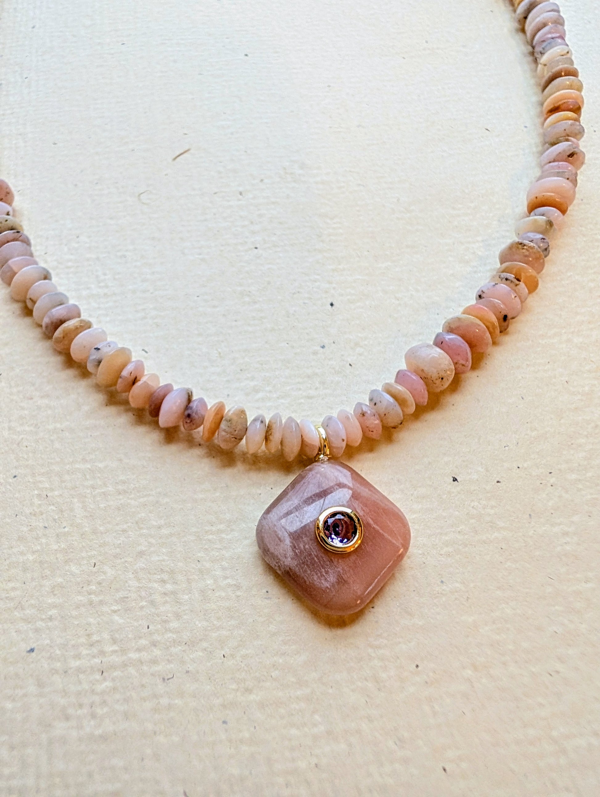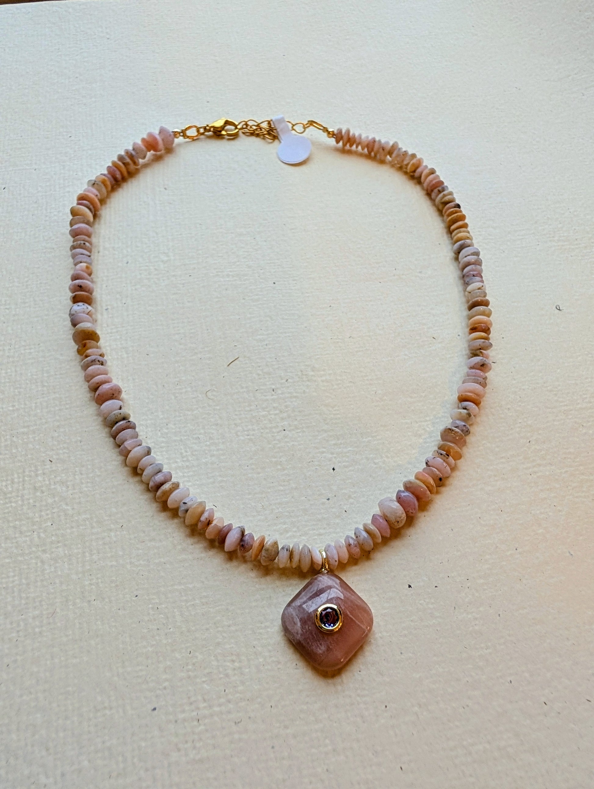 Materials: Natural rhodonite gemstones, pink bezel‑set gemstone pendant, gold‑plated stainless steel findings