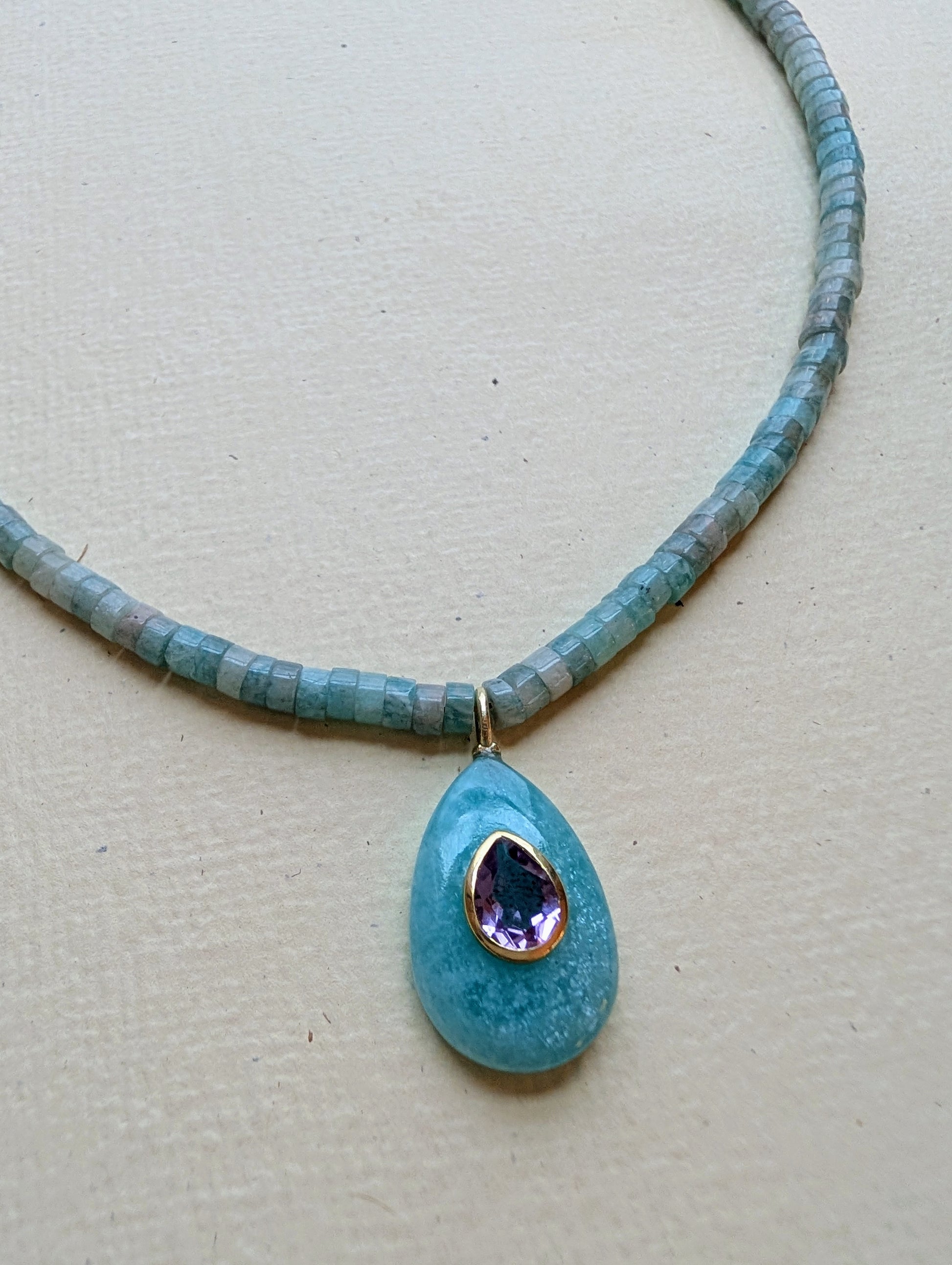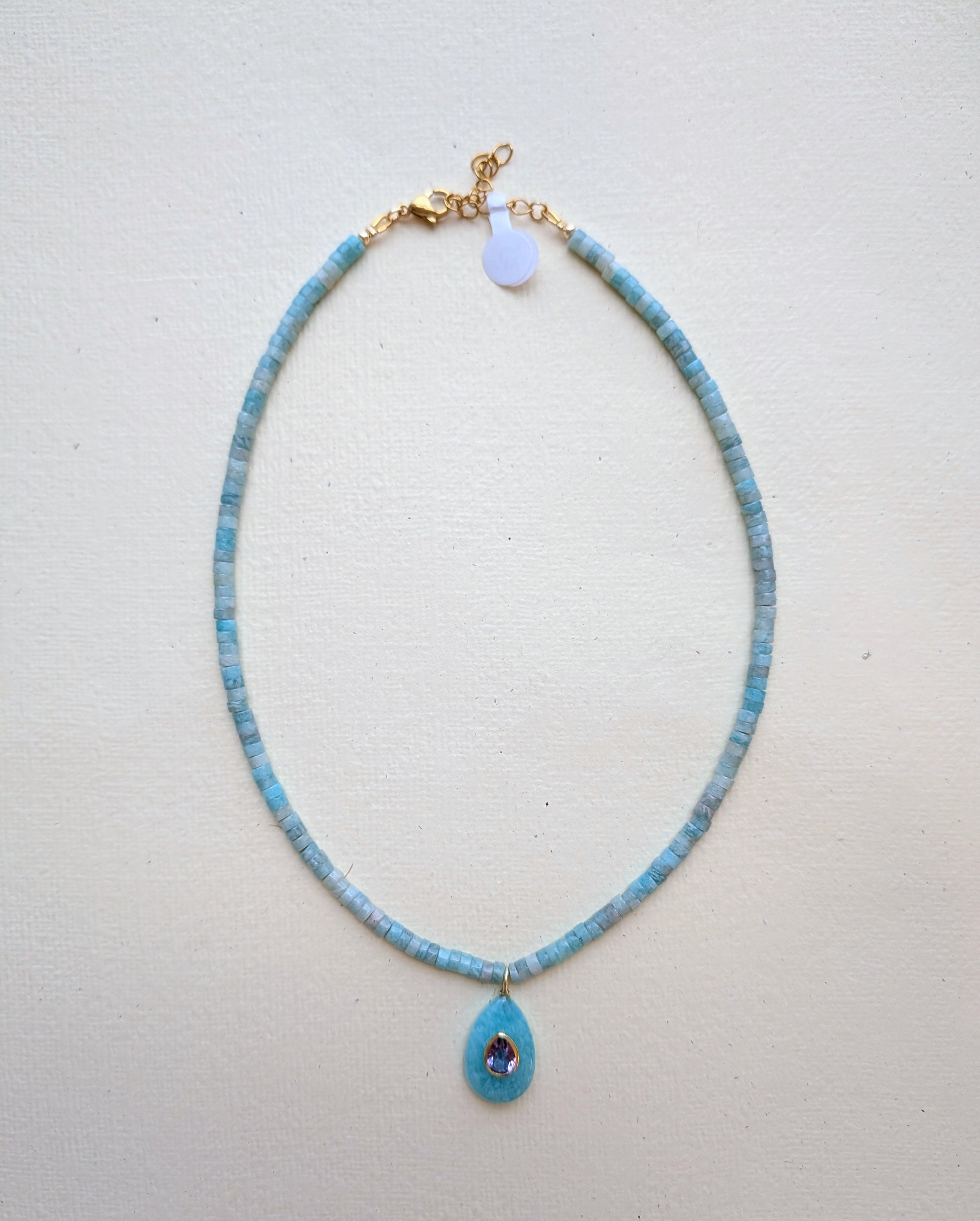 A serene, ocean‑washed layer crafted from natural aquamarine — a pale blue gemstone known for its calm, watery glow. Finished with a matching aquamarine bezel‑set pendant, Mini 7 brings a soft, airy brightness to your coastal stack. Made with durable, gold‑plated stainless steel components, it’s waterproof, tarnish‑resistant, and designed for effortless everyday wear