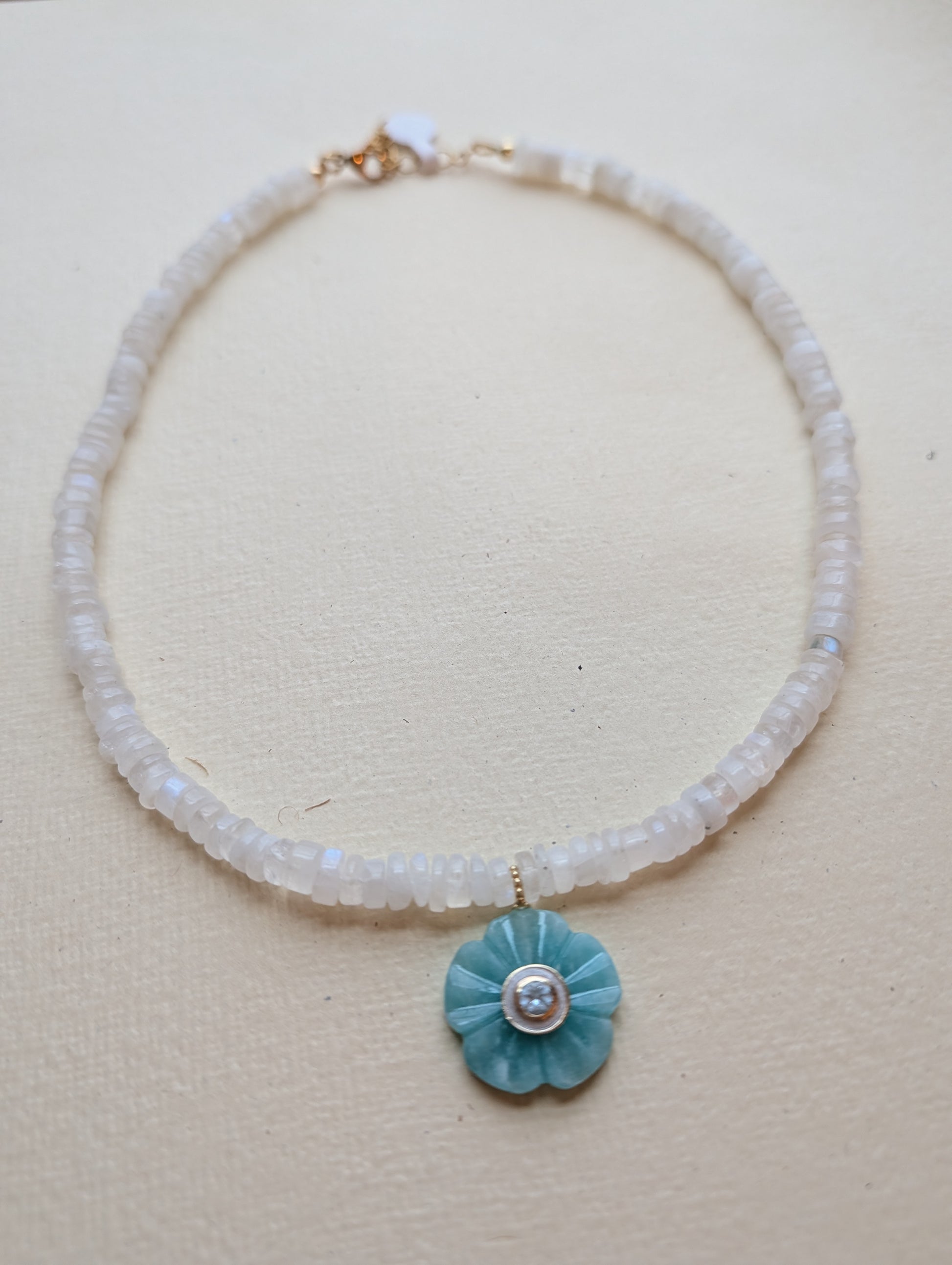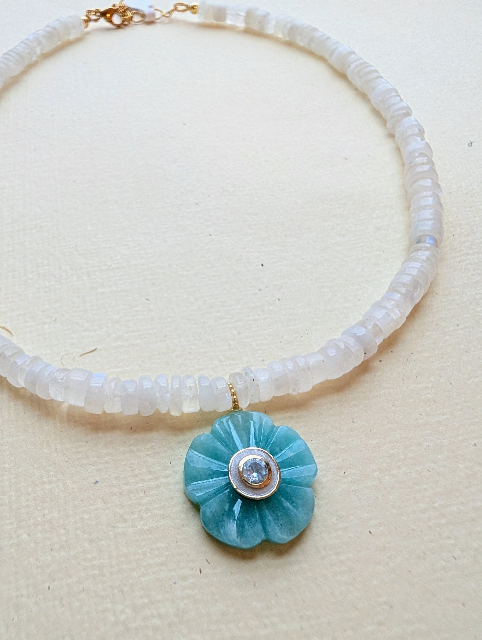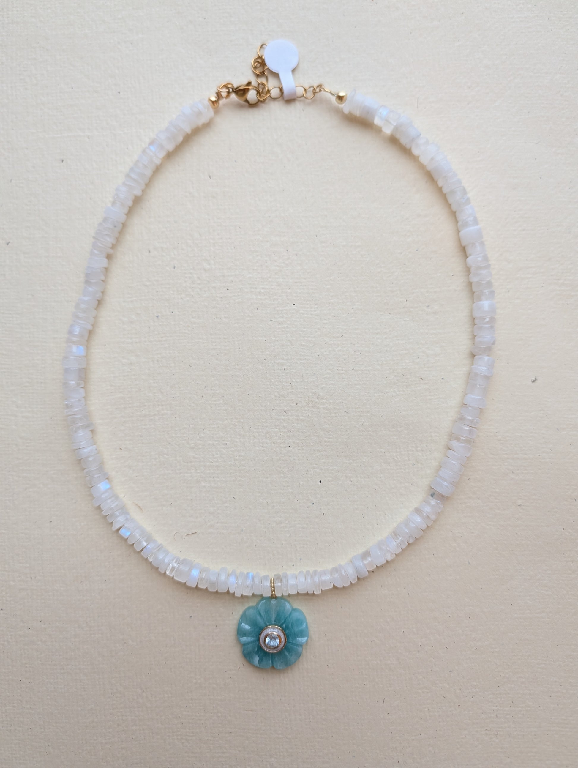 Materials: Natural moonstone gemstones, blue flower pendant, gold‑plated stainless steel findings